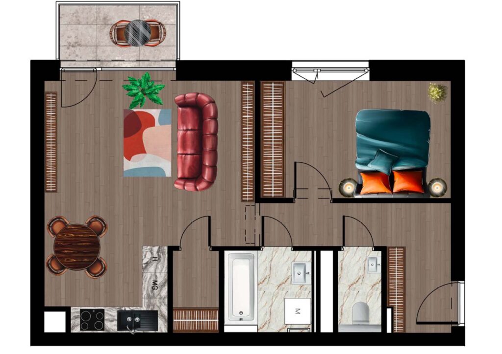 Jelen dokumentum és az azon szereplő információk tájékoztató jellegűek. Az ingatlanfejlesztő bármely a dokumentumhoz képesti eltéréssel kapcsolatban kötelezettséget vagy felelősséget nem vállal. Az alaprajzon található bútorok illusztrációk, felszereltség műszaki leírás szerint.