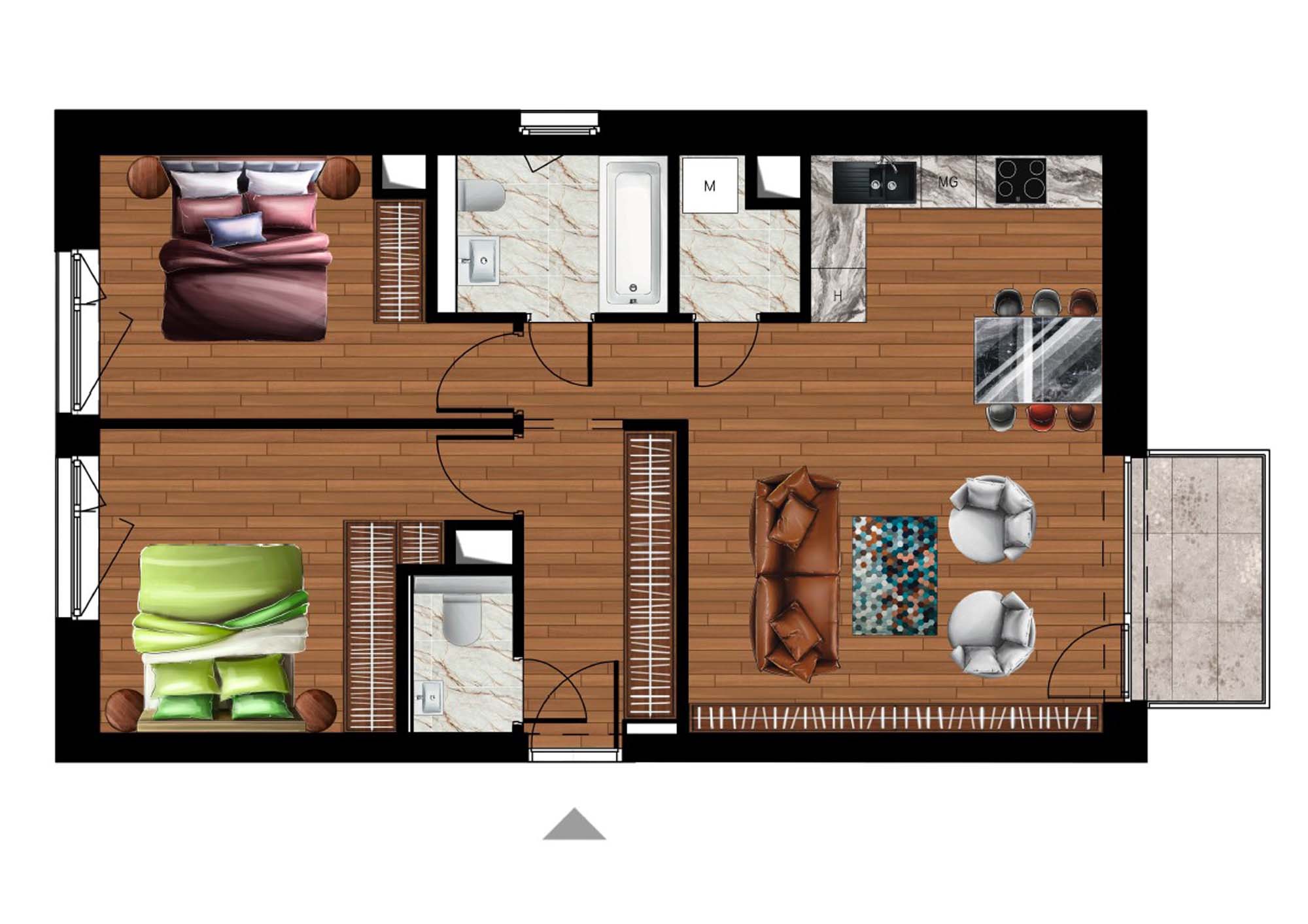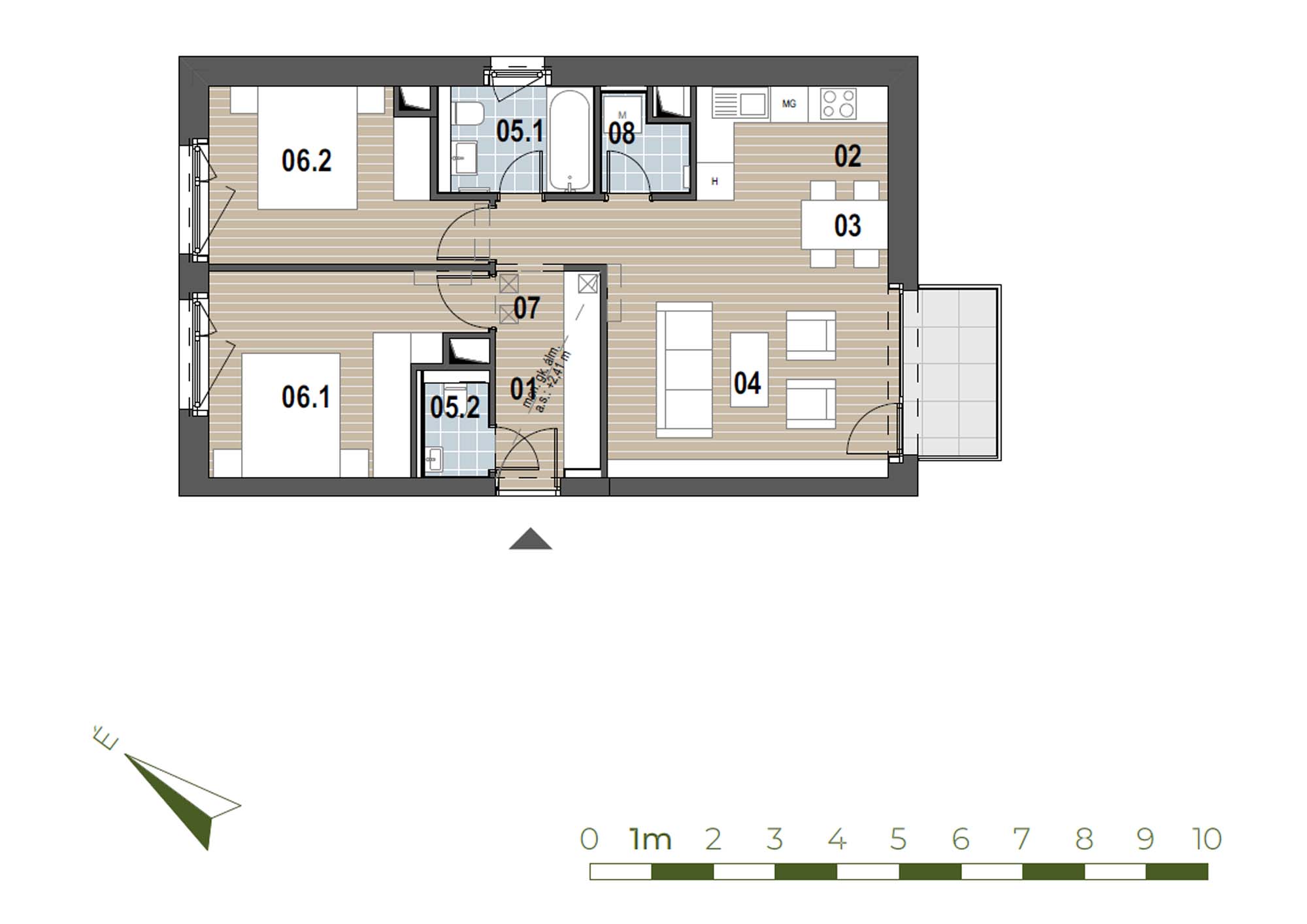 Jelen dokumentum és az azon szereplő információk tájékoztató jellegűek. Az ingatlanfejlesztő bármely a dokumentumhoz képesti eltéréssel kapcsolatban kötelezettséget vagy felelősséget nem vállal. Az alaprajzon található bútorok illusztrációk, felszereltség műszaki leírás szerint.