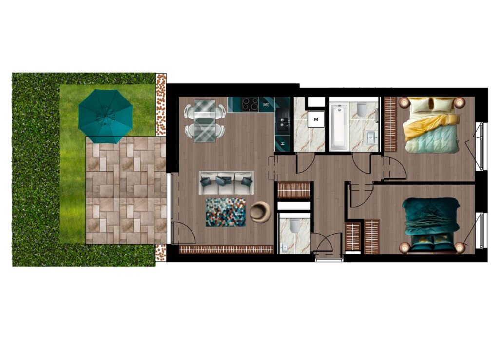 Ez a 2 hálószobás földszinti lakás tökéletes választás nagyobb családoknak, akik tágas, világos tereket és kertkapcsolatot keresnek egy modern, csendes lakóövezetben.