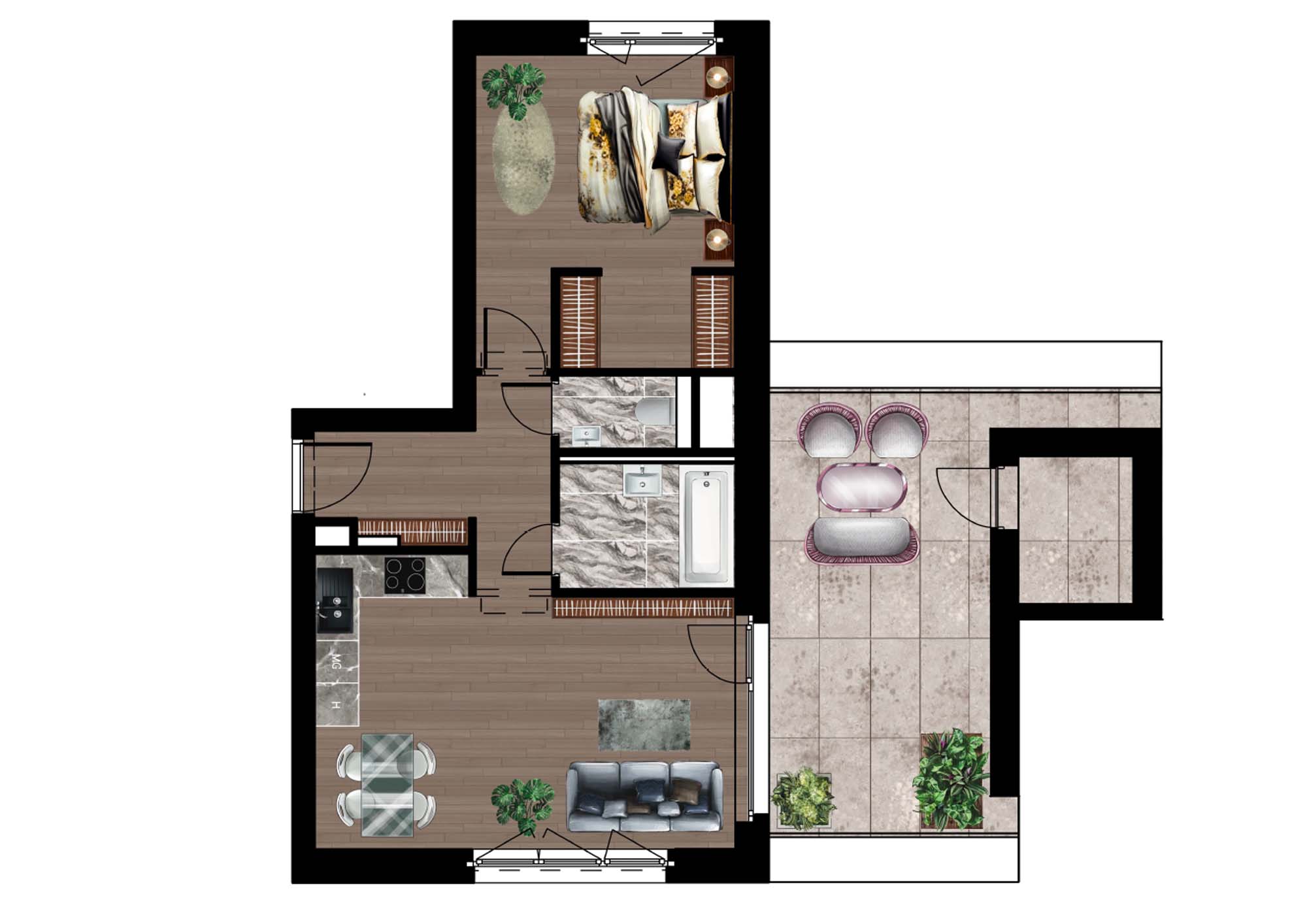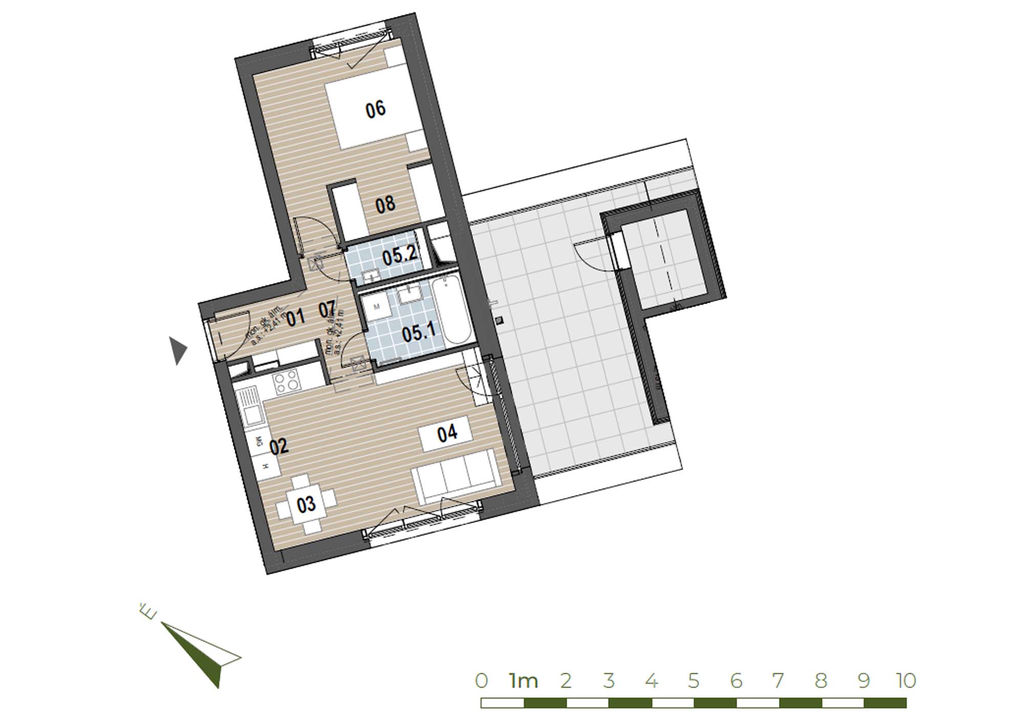 Jelen dokumentum és az azon szereplő információk tájékoztató jellegűek. Az ingatlanfejlesztő bármely a dokumentumhoz képesti eltéréssel kapcsolatban kötelezettséget vagy felelősséget nem vállal. Az alaprajzon található bútorok illusztrációk, felszereltség műszaki leírás szerint.