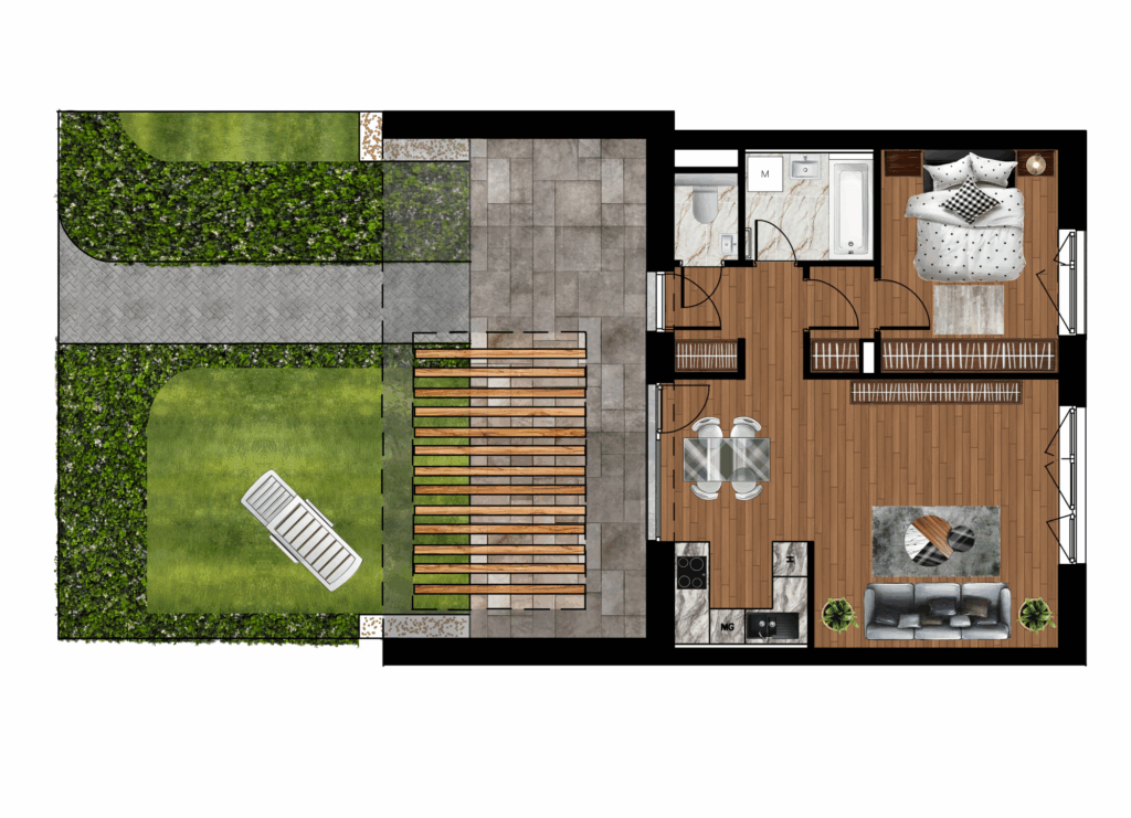 A nappali tágas, közvetlen kertkapcsolattal és egy hangulatos terasszal rendelkezik, amely ideális helyszínt biztosít reggeli kávézásokhoz vagy esti pihenéshez. A kert kizárólagos használatú, így kisgyermekes családoknak, kutyatulajdonosoknak vagy kertészkedést kedvelőknek is tökéletes.